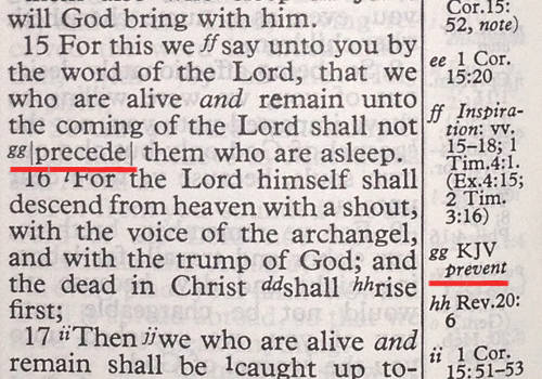 The 1967 makes word changes directly in the text, making it quite easy to read, while clarifying words with changed meaning since 1611. It’s easiest to show this with an example, using 1 Thessalonians 4:15. First, the 1967 Scofield: