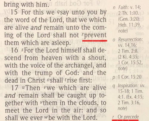 The Greek for precede (φθάνω phthanō) means come before. Notice vertical bars around precede notify you of a language change (with the original word in the margin) — prevent has been changed to precede, which is accurate.